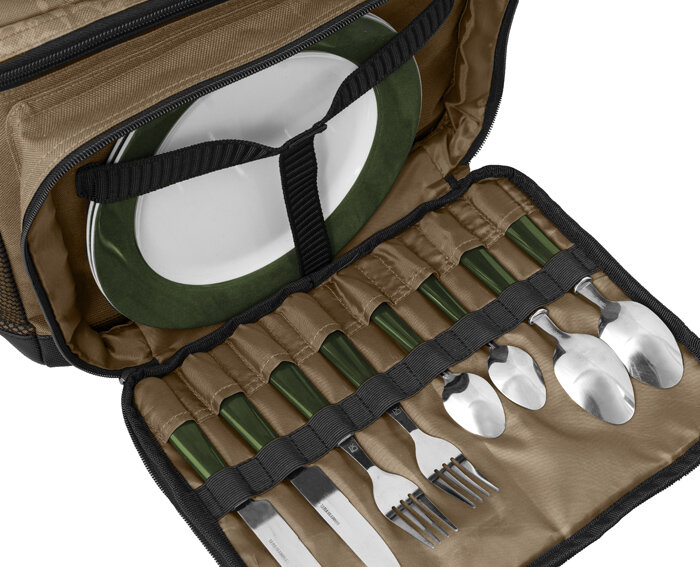 En la parte frontal hay un bolsillo grande que contiene un juego de comedor completo para dos personas. Incluye dos platos de plástico, dos cuchillos, dos tenedores, dos cucharas y dos cucharillas para postre. ¡Ahora puedes disfrutar de más comodidad, incluso cuando estés cerca del agua con tu pareja o compañero!