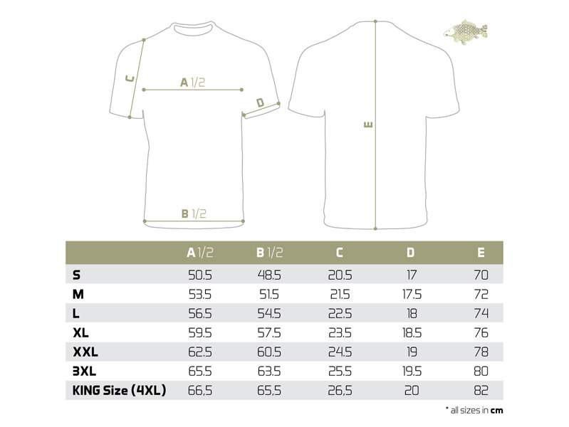 La camiseta en sí es de alta calidad, al igual que la impresión en color utilizada. Las ofrecemos en una amplia gama de tamaños desde S hasta KING SIZE (equivalente a 4+XL, que en la mayoría de los países se marca como XXXXXL). Por lo tanto, el modelo King size puede vestir fácilmente incluso a los pescadores más robustos con un peso de 135kg+.